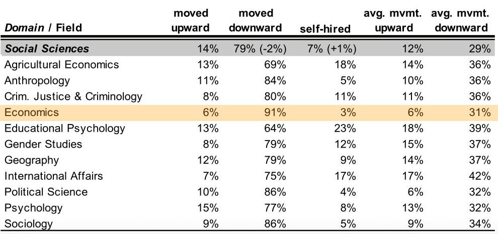 According to a 2022 study in Nature, 6% of academic economists place at a higher-ranked school than their PhD, third-last among all fields after Classics & Religious Studies, and less than half the average for social sciences: