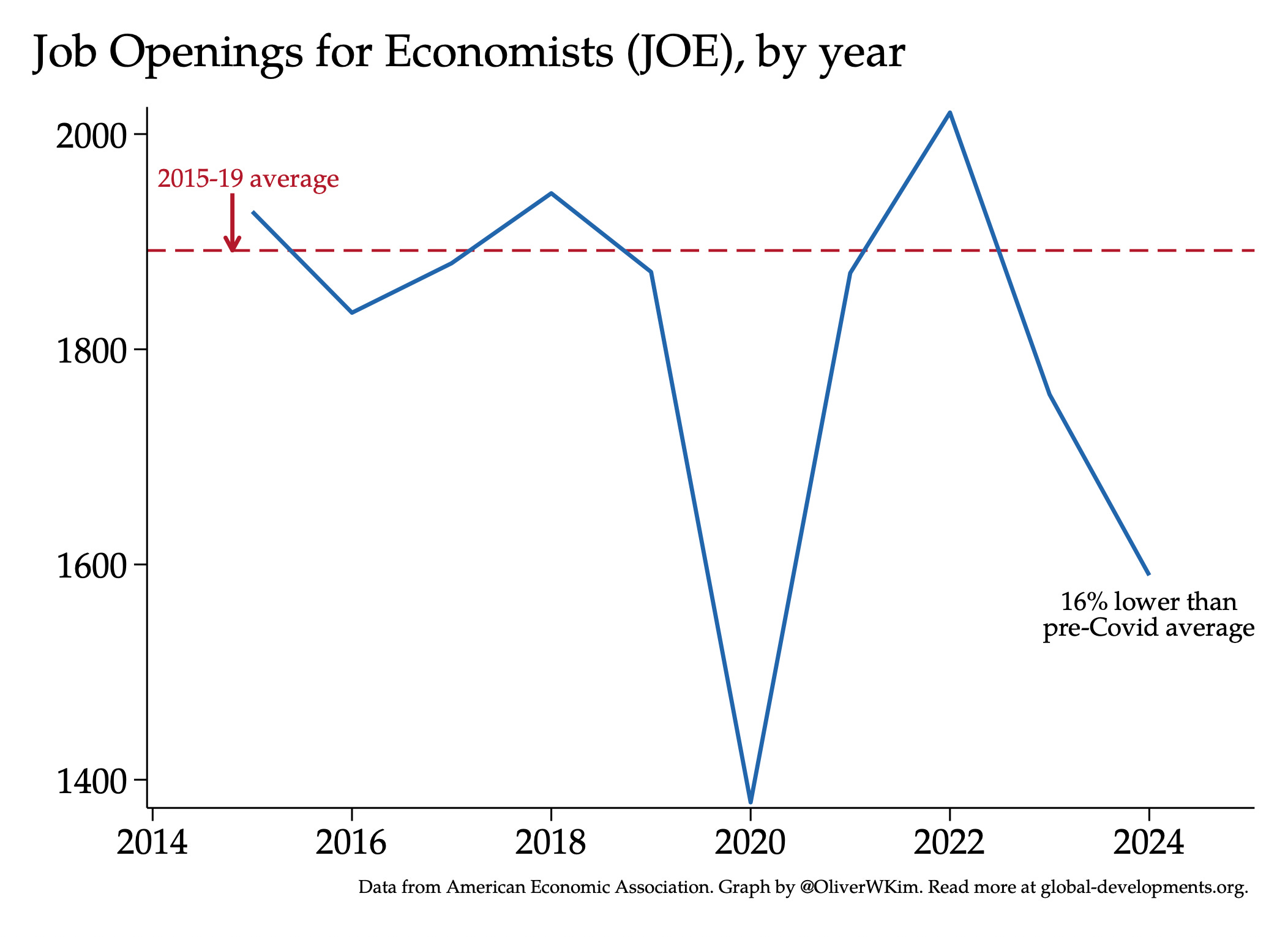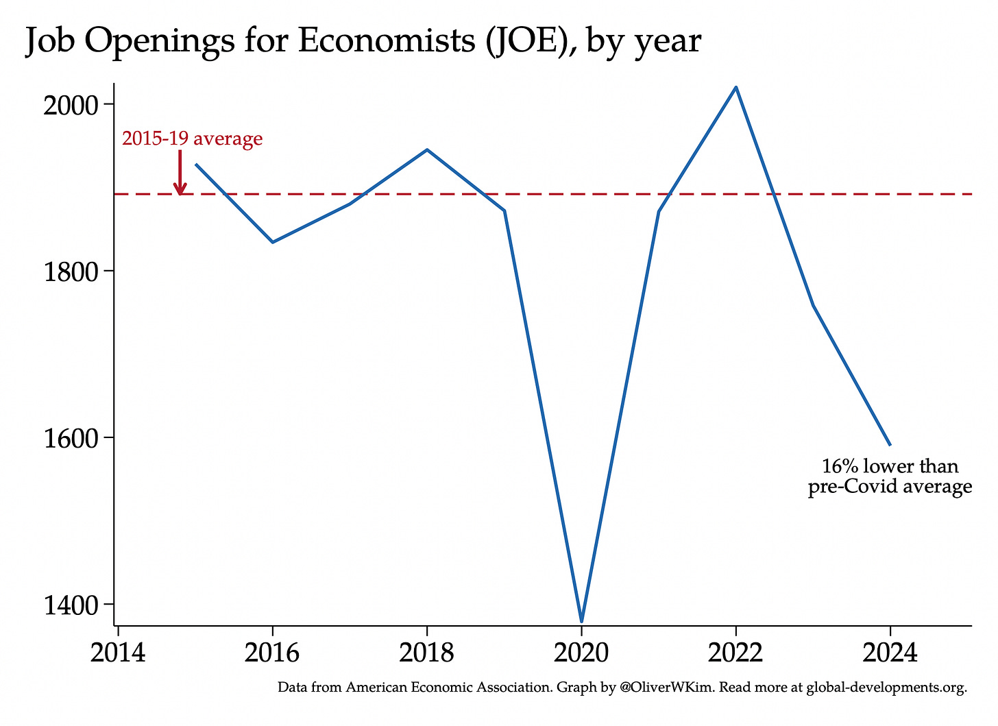 On a normal day, this blog is about the poorest people in the world. The median economist made $115,440 in 2024. Until recently, this was a profession with an employment rate of 100%. Most people might ask: why should we care?