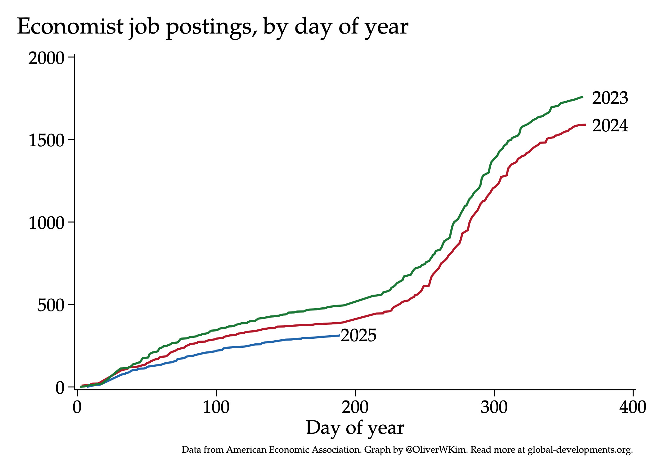 And of course, all of this decline occurred before the litany of disasters that have recently hit the Econ job market. In May, Jerome Powell announced that the Federal Reserve—perhaps the largest employer of economists in America—would cut its workforce by 10%. The federal government has frozen hiring, as has the World Bank. Hit by the dual threat of fines and looming cuts to federal funding, Harvard, MIT, the University of Washington, Notre Dame, Northwestern University, among others, have announced hiring freezes and budget cuts.1